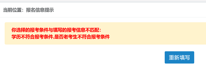 16.进入考试报名填写报名信息后,出现提示信息“你选择的报考条件与填写的报考信息不匹配:学历不符合报考条件,是否老考生不符合报考条件”,如下图,是什么原因?
