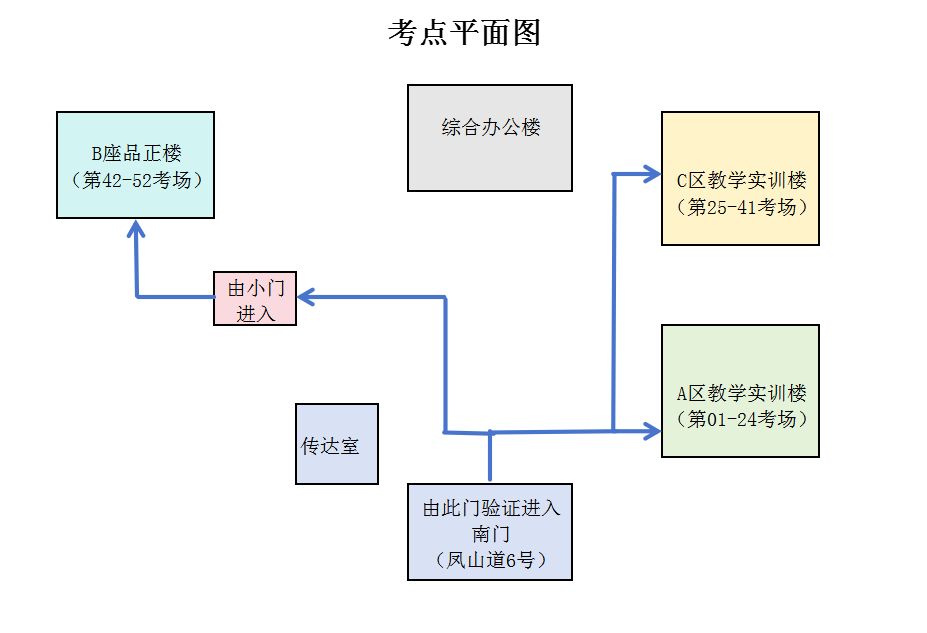 三、建议乘坐公共交通前往考点,入校请遵守考点相关要求,应试人员及送考人员均不得开车入校。考试开始5分钟后不得进入考场教室,请提前规划好路线和时间,考点平面图见附件1。