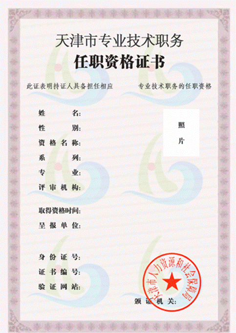 天津市专业技术职务任职资格电子证书样式